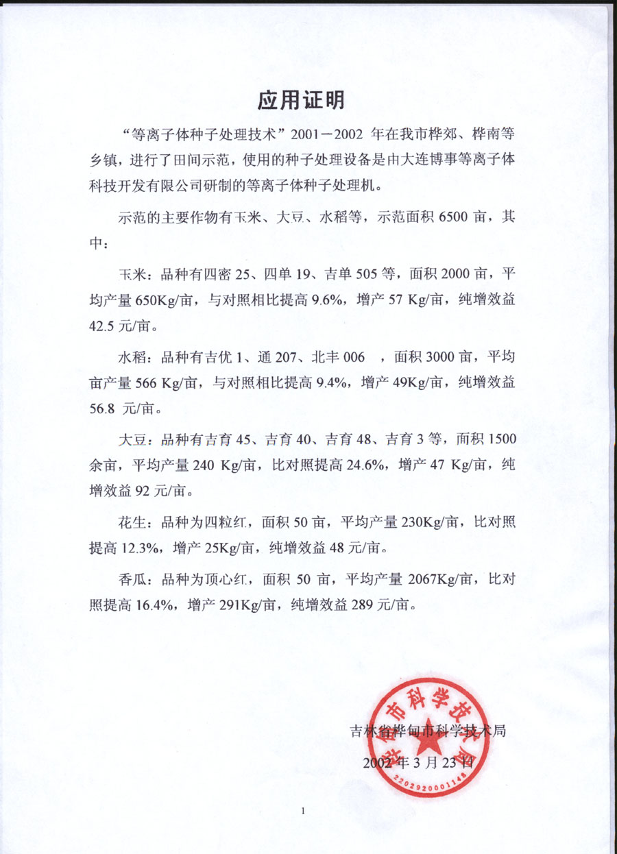 等离子体种子处理技术于2001年被列入国家863计划项目,山西省重大科技攻关项目。自2001年起,我们与吉林省农科院、山西省农科院以及多个地方科技局合作进行了长期的试验示范工作,并取得了良好的试验结果。